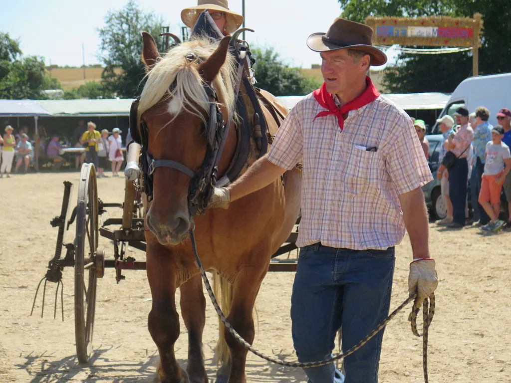 Dimanche, Jean Michel Daguenet, le président de l’association Le Temps des Moissons, a ouvert le grand défilé des moissonneux, son petit-fils dans les bras. Une belle image, la relève peut-être…