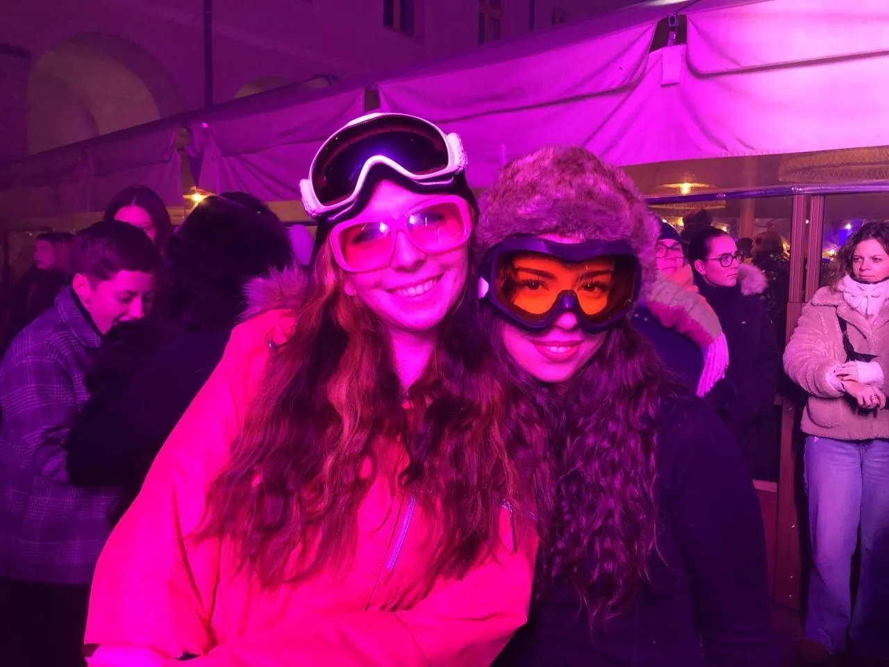 Morgane et Laura ont plus que respecté le dress-code avec leurs lunettes de ski pour le Sunday vibes, à la Visitation, au Mans (Sarthe), dimanche 28 décembre 2025. Ambiance garantie. © Ouest-France