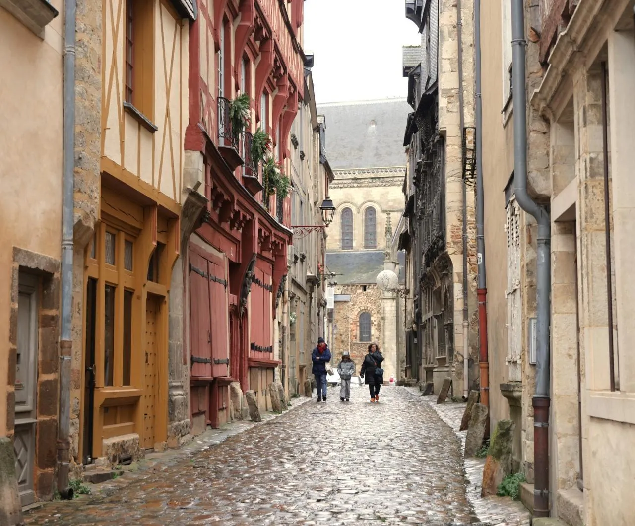 Isabelle Noyer, guide conférencière (à droite), présente cet épicentre des tournages dans la vieille ville, square Jacques-Dubois (au-dessus du tunnel) et rue de la Reine Bérangère. « Le Bossu » y a notamment été tourné en 1997, nécessitant l’ajout d’un décor. Plus récemment, « Les caprices de l’enfant roi », de Michel Leclerc, en juin 2025, avec Artus et Franck Dubosc. © Ouest-France