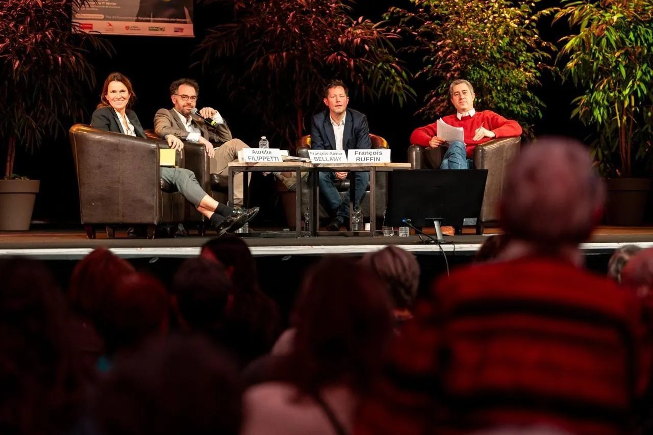 Le forum Philo Le Monde Le Mans s’est terminé par un grand débat avec comme invités Aurélie Filippetti, François-Xavier Bellamy et François Ruffin (micro en main, l’animateur Jean Birnbaum, coordinateur du Forum). © Le Maine Libre - Xavier SARRAT