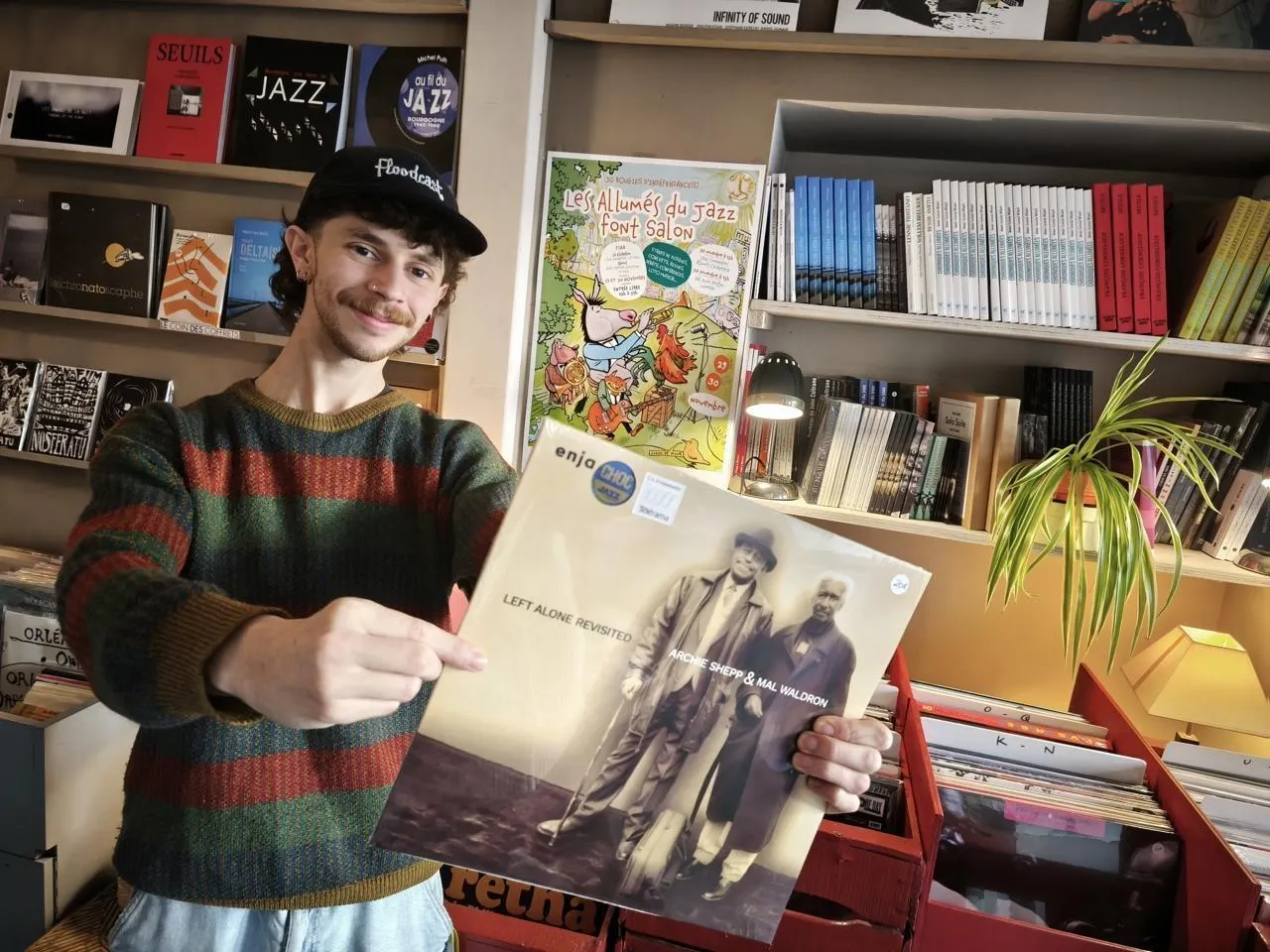 Vincent Tallé, le nouveau disquaire des Allumés du Jazz, au Mans, rue de la Galère, et cheville ouvrière du salon. Ici avec son coup de cœur du moment, le dernier disque d’Archie Shepp, légendaire saxophoniste qui fit les grandes heures du festival Europajazz. © Ouest-France