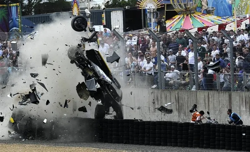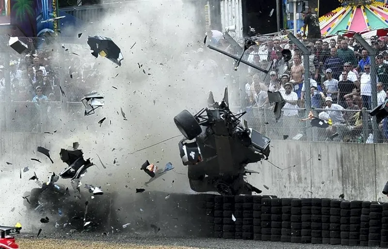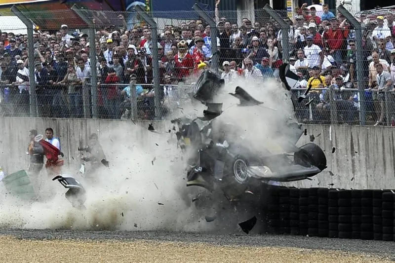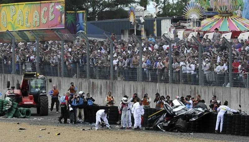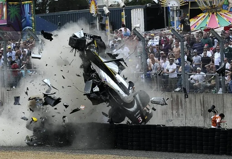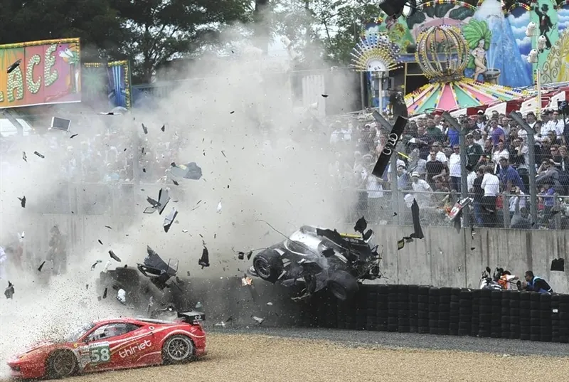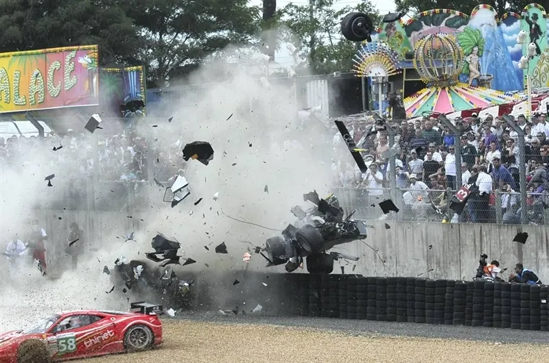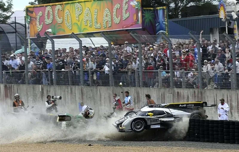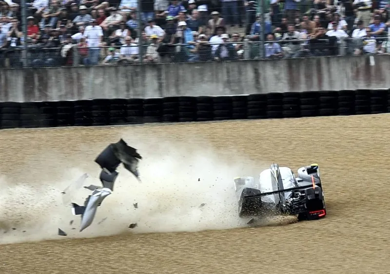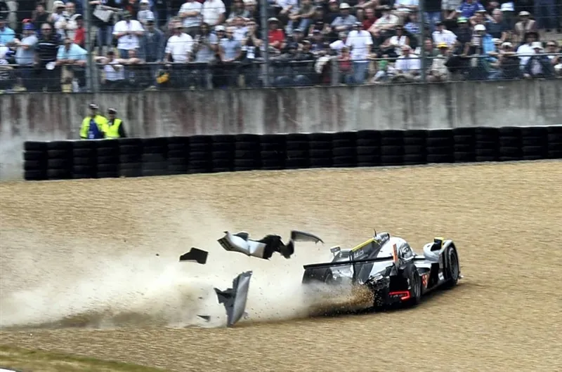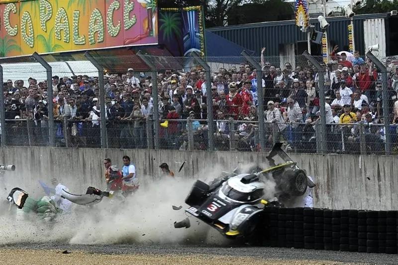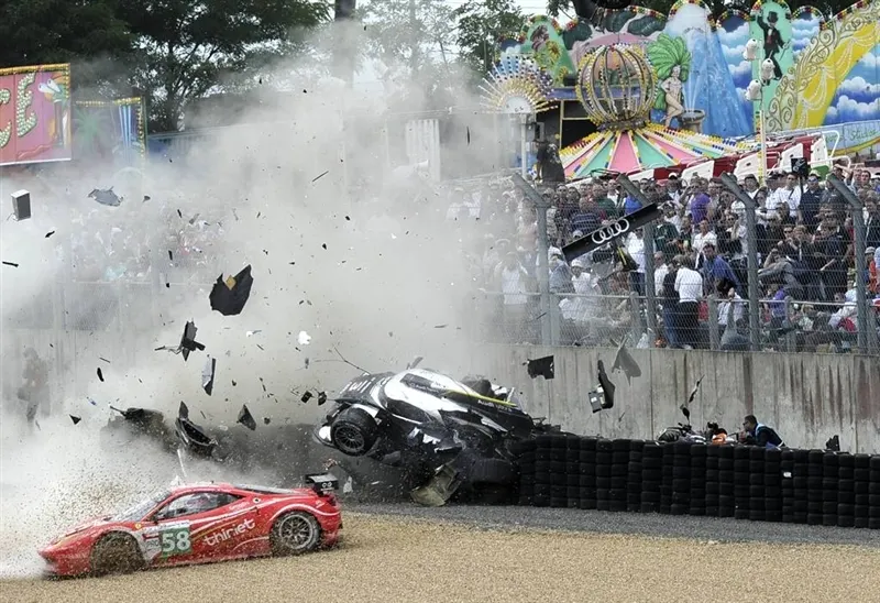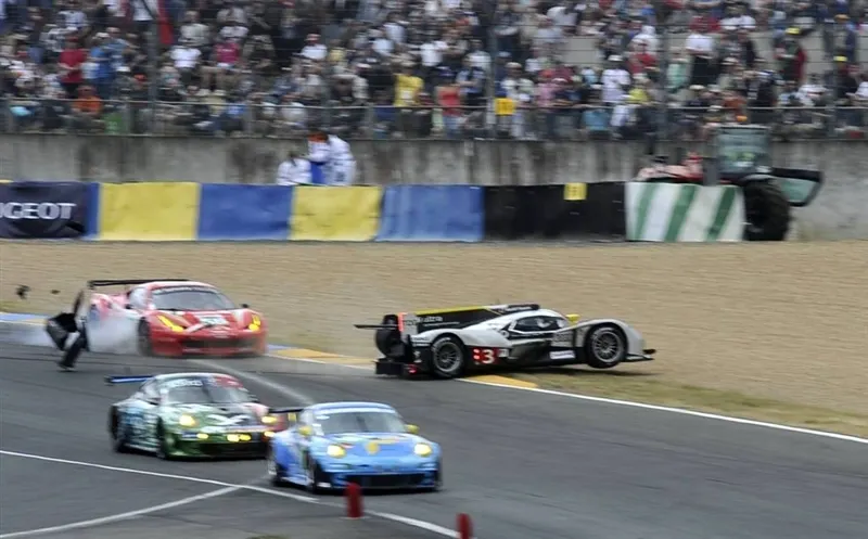 En voulant dépasser la Ferrari n° 58 du team Luxury Racing dans le virage du Tertre rouge, Allan Mc Nish a fait une spectaculaire sortie de piste au volant de l’Audi n° 3 en allant percuter le rail de sécurité