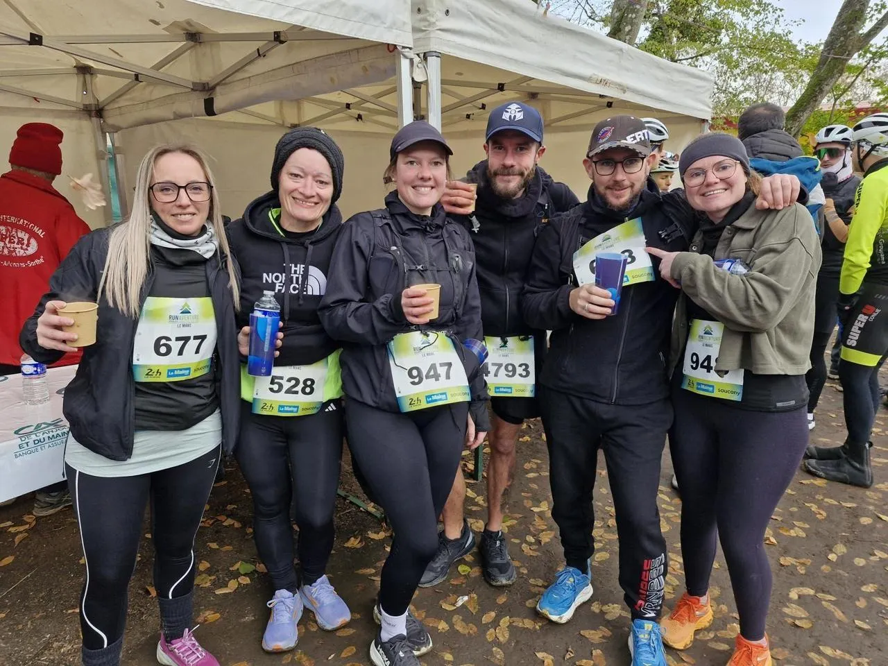Estelle (au centre) et son groupe d’amis savourent l’après-course après avoir terminé les 10 km, bien au-delà de l’objectif fixé. © Photo : Le Maine Libre