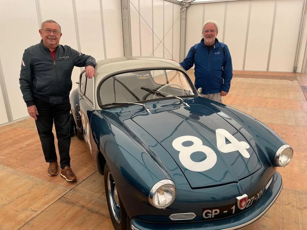 Pierre Launay (à gauche) et le président du Club Alpine Dieppe, Didier Lemeunier, de chaque côté de la première Alpine, l’A106, avec laquelle le fondateur de la marque, Jean Rédélé, a couru la fameuse course italienne Mille Miglia, en 1955. © Ouest-France