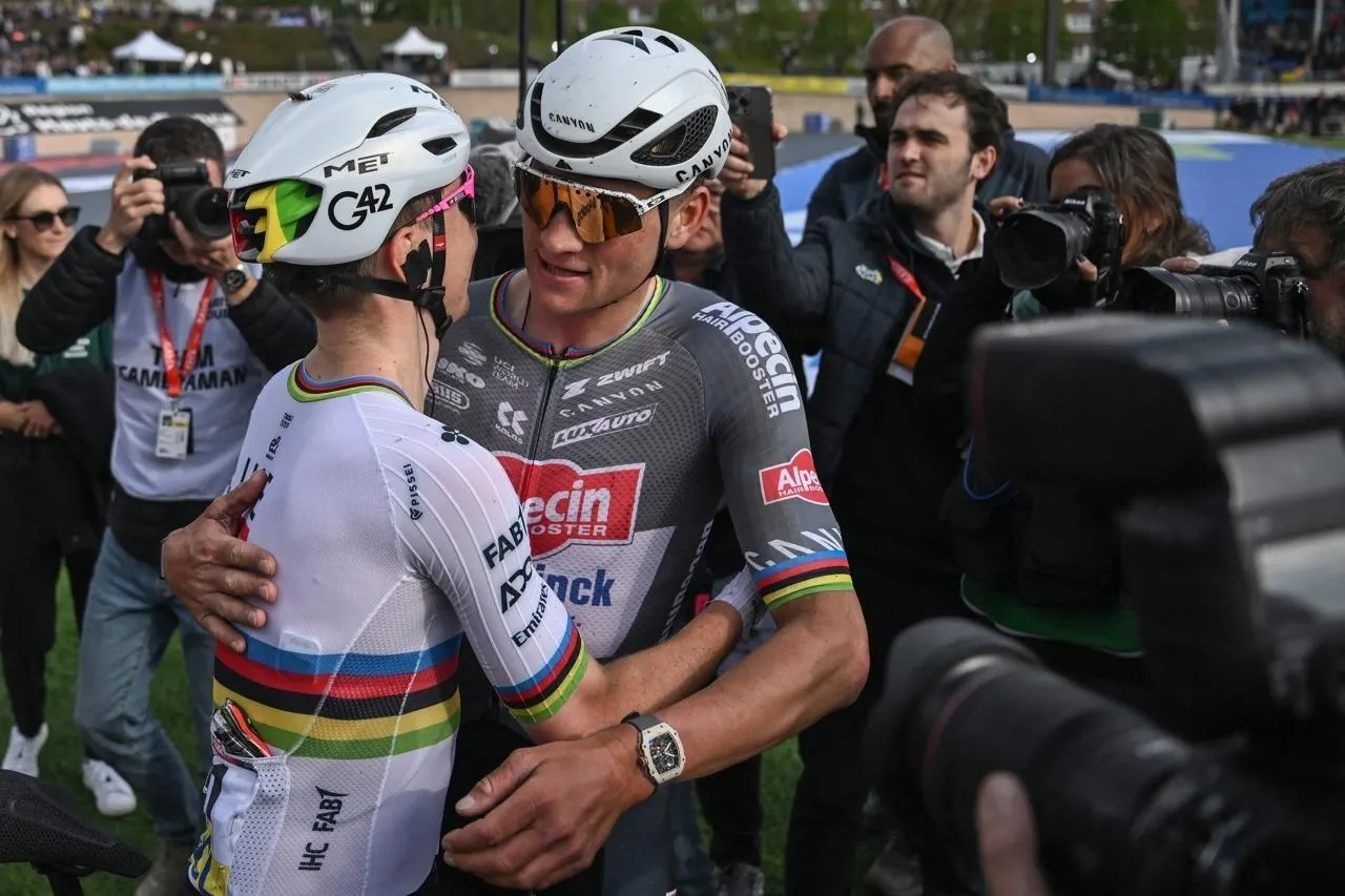 Tadej Pogacar et Mathieu van der Poel après l’arrivée de Paris-Roubaix, le 13 avril 2025. © Jeff Pachoud / AFP