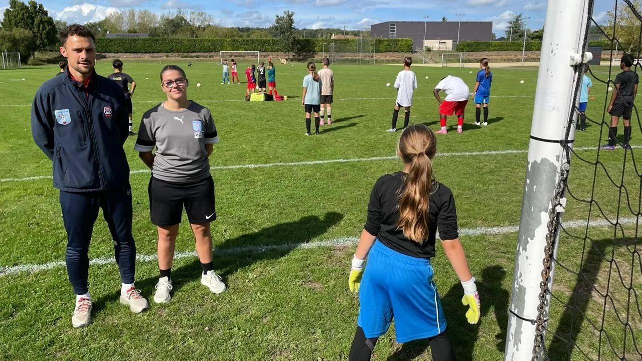 Jordan Allaire et Lola Piron, responsable technique et entraîneuse du RCF, lors de la première séance de foot sur le temps scolaire ce vendredi 12 septembre 2025. © Le Maine Libre – Louis GOHIN