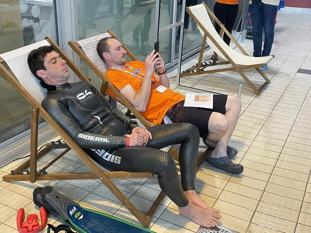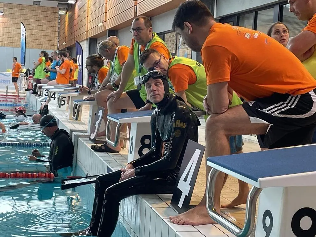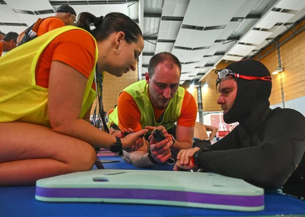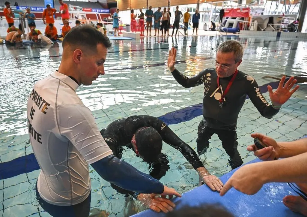 Julien Piveteau entouré de son coach (à gauche) et d’un juge sécurité a réalisé la meilleure performance du jour en apnée statique. Avant d’être disqualifié. © Photo Le Maine Libre - Denis LAMBERT