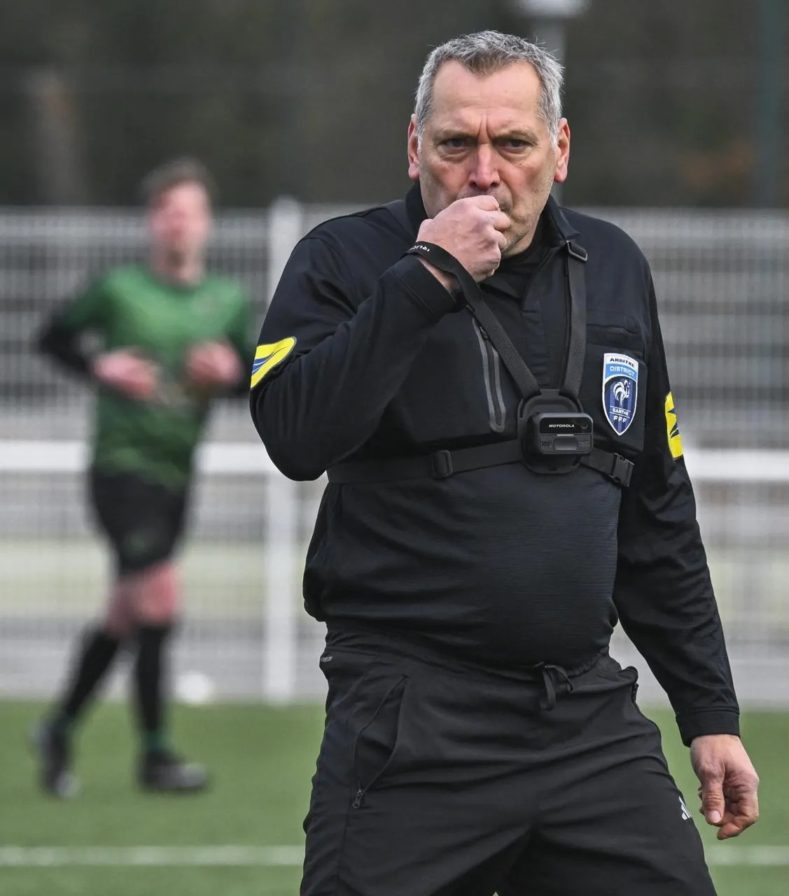Le dimanche 11 janvier 2026, Eric Chartrain était le premier arbitre en Sarthe à tester la caméra portative. Un dispositif visant notamment à protéger les hommes en noir de toute agression. © Archives Le Maine Libre - Denis Lambert