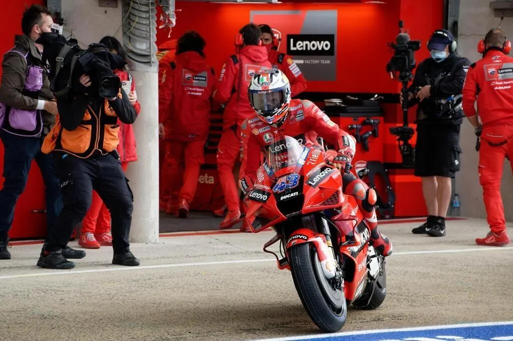 Alors qu’elle n’était plus apparue depuis l’Argentine en 2018, la procédure Flag-to-Flag (drapeau à drapeau) a été lancée par la direction de course pour changement d’adhérence. Dans le même temps, Jack Miller tirait tout droit dans le bac à graviers, et le champion du monde Joan Mir allait au tapis, quand tous les ténors repassaient illico à leur box pour récupérer des machines équipées pour la pluie.