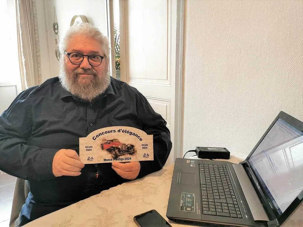 Patrick Gautier présente la plaque commémorative qui sera remise à chaque propriétaire exposant un véhicule de prestige le lundi 10 juin à Moncé-en-Belin. © Le Maine Libre