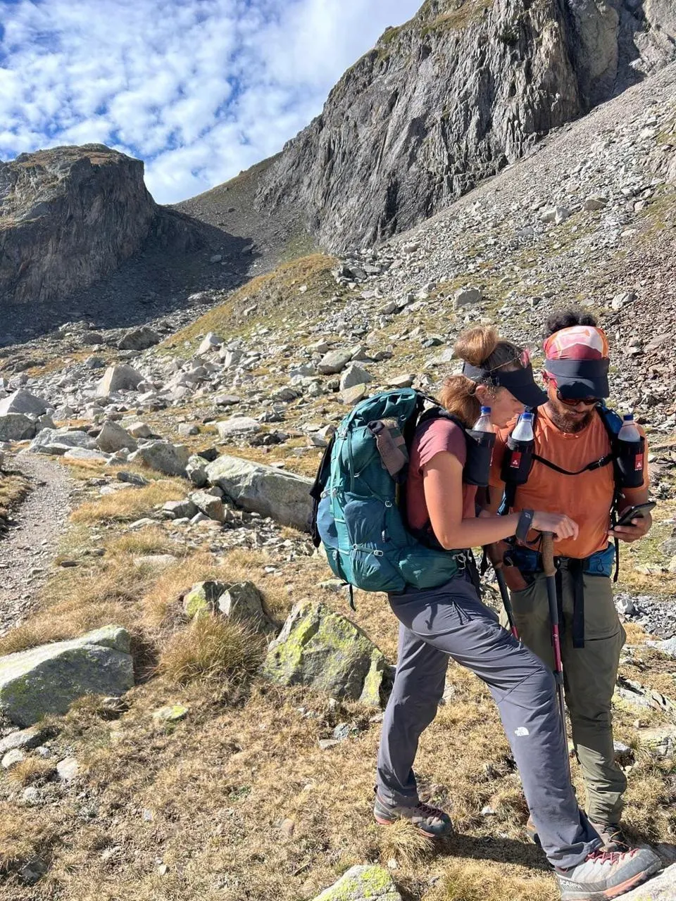Suzel et Matéo en pleine montagne, leurs sacs à dos contenant entre 12 et 20 kg de charge. © Par Monts et Par Soi