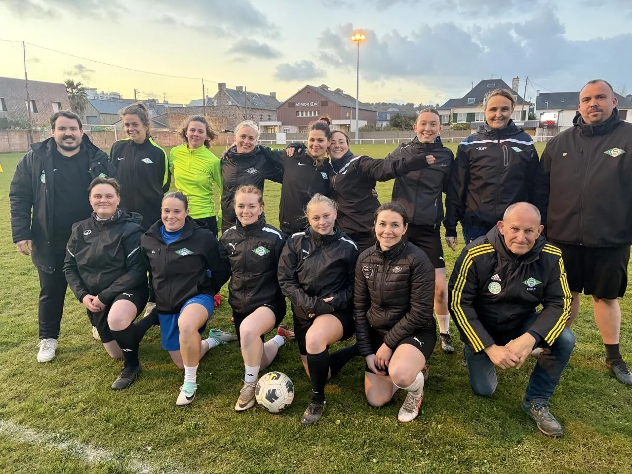 L'équipe de l'US Erquy va jouer en direct à la télévision. De gauche à droite : 2e rang : Jérémy (entraîneur) ; Audray, Élena, Anaïs, Justine, Océane, Lilou, Émeline, Romain (coach adjoint). 1er rang : Pauline, Kaïla, Fleur, Daisy, Jeane, Didier (arbitre et dirigeant). © Ouest-France