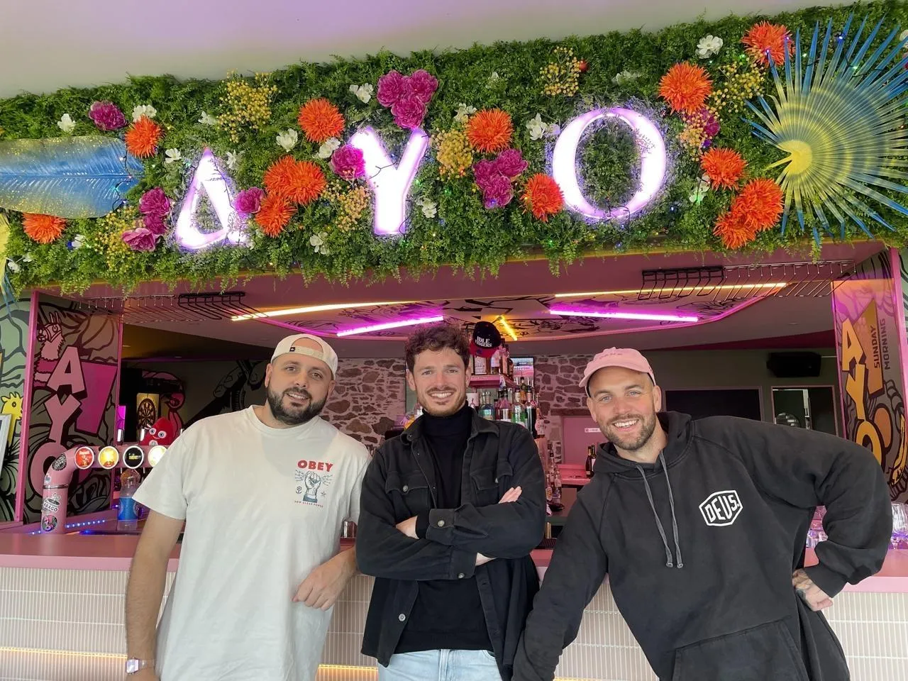Au centre, Mathias Guérin, participant au 1er marathon du bar Ayo des Sables-d’Olonne (Vendée), entouré par Alexandre Bernardet et Antoine Le Cam, gérants de l’établissement. © Ouest-France