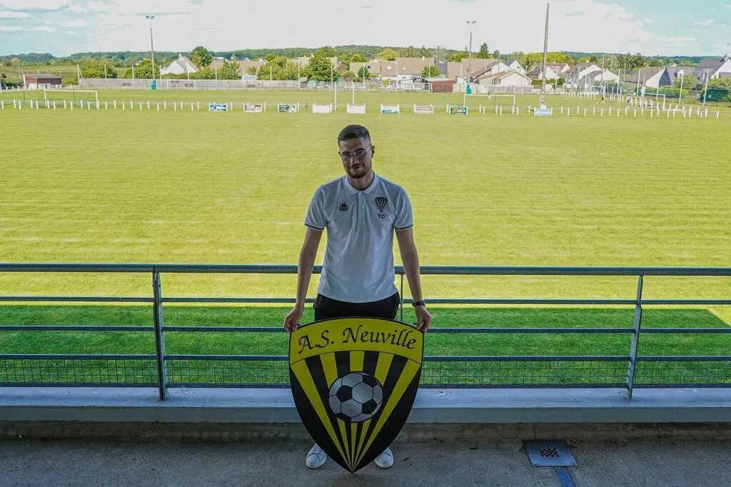 Le vice-président de Neuville-sur-Sarthe Thomas Durot, peut fièrement poser devant le logo de son club, vainqueur du concours Le Maine Libre Football Club. © Le Maine Libre