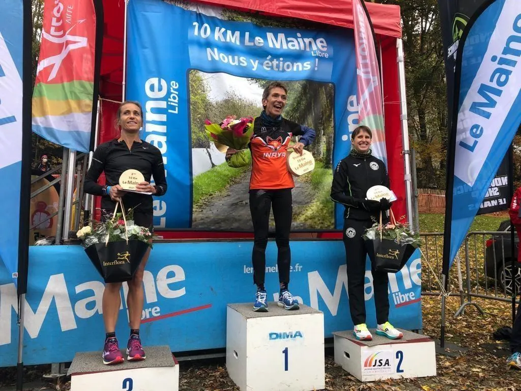Le podium masculin des 10Â Km du Maine Libre. Avril devance Mefta et Le Gall. Le Maine Libre