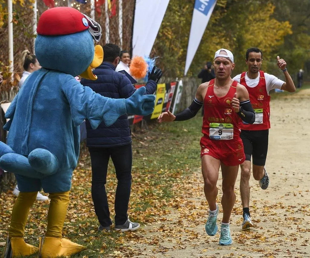 Anthony Avril (SOM) vainqueur chez les hommes devant Abdellatif Mefta (SOM) ce samedi 20Â novembre 2021 aux 10Â km Le Maine Libre. © Denis LAMBERT