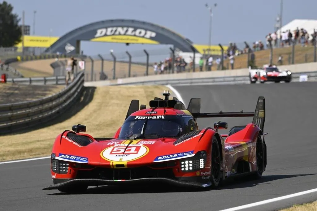 Ferrari domine la journée test au Mans. L’écurie italienne a été la plus performante, mardi 6 juin 2023, au cours des essais libres. La Ferrari n° 51 a signé le meilleur temps. Vincent MICHEL / Ouest-France