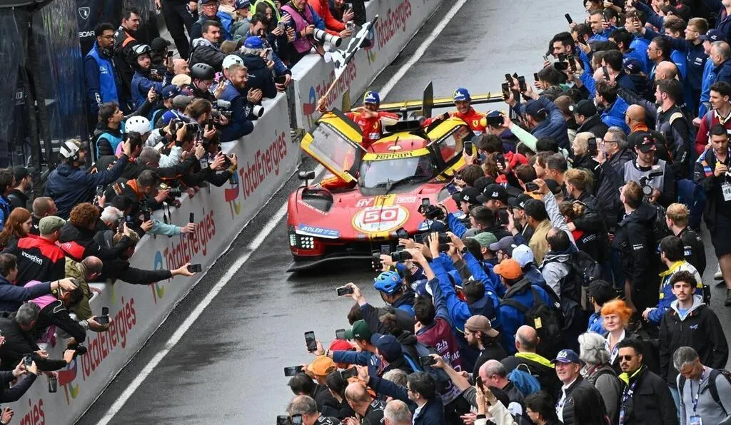 La Ferrari victorieuse des 24 Heures du Mans 2024 s’offre une haie d’honneur au milieu du public. © Franck Dubray / Archives Ouest France