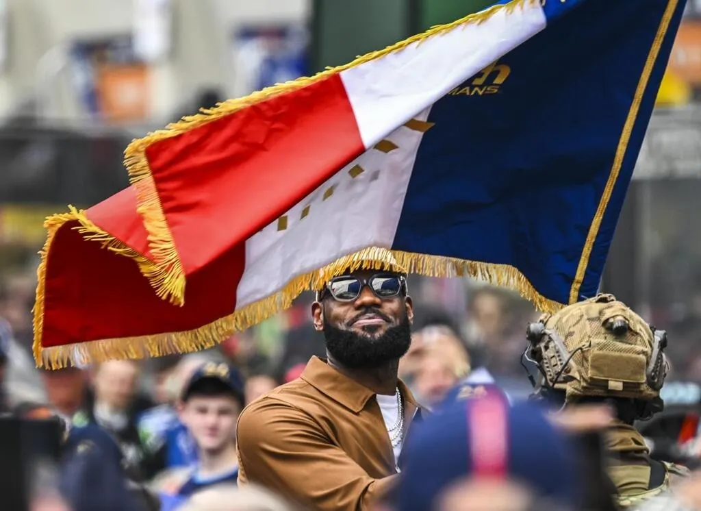 Comme le veut le protocole, Lebron James s’est vu remettre le drapeau tricolore par l’armée, quelques minutes avant de l’agiter pour donner le départ. © Le Maine Libre – Denis LAMBERT