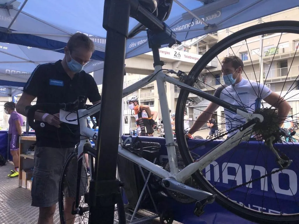 Des coureurs au stand Shimano service center pour effectuer les derniers réglages. Le Maine Libre