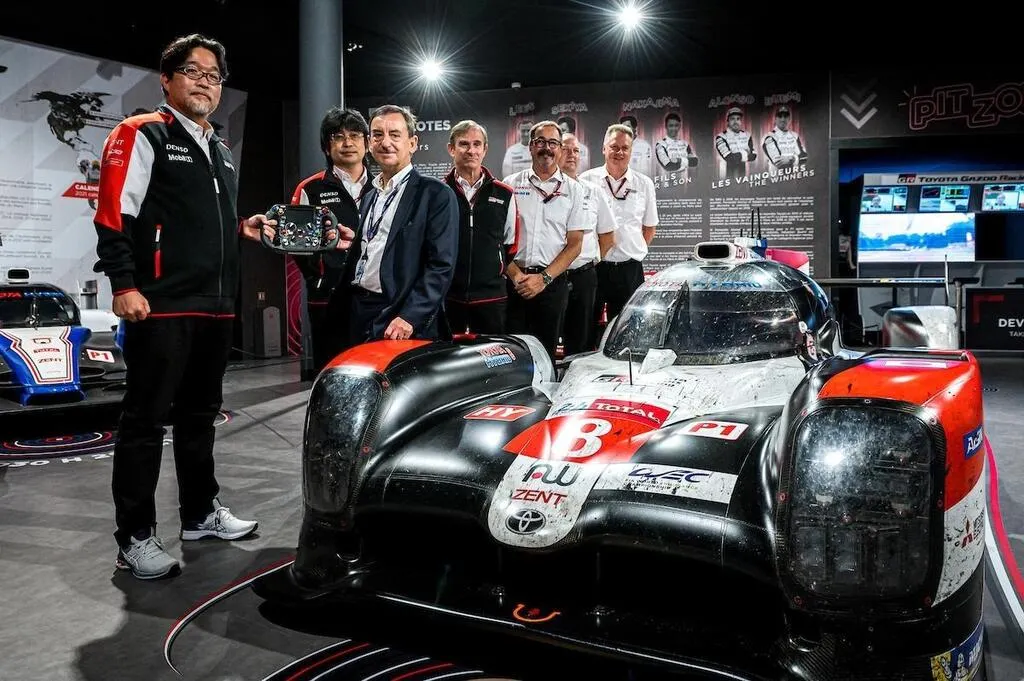La Toyota TS050 Hybrid est entourée, entre autres, de Pierre Fillon, président de l’Automobile Club de l’Ouest, Fabrice Bourrigaud, directeur du Musée des 24 Heures du Mans (Sarthe) et de Murata Hisatake, président de Toyota Motorsport GmbH. © DR