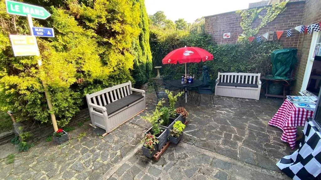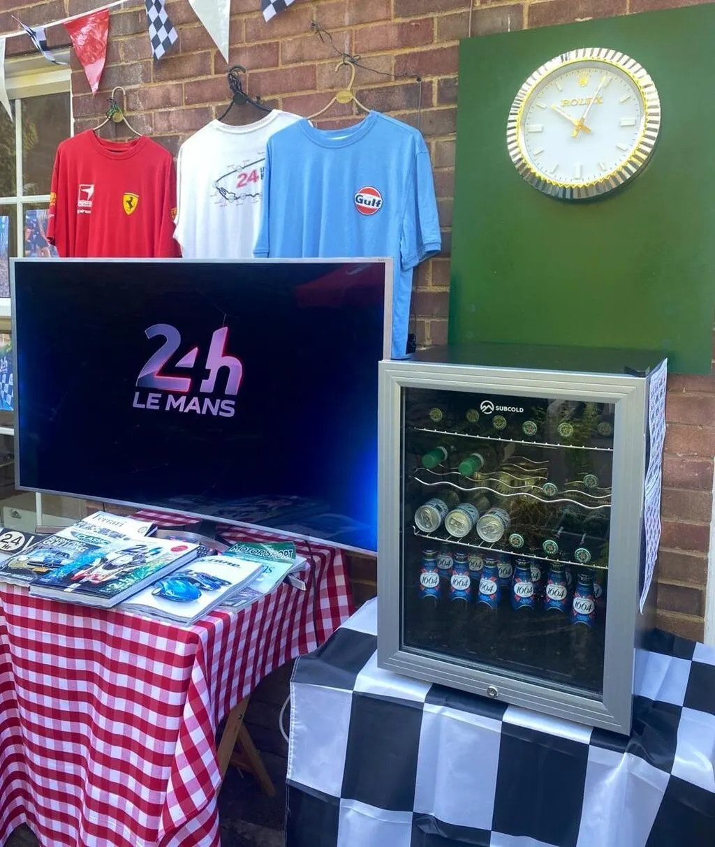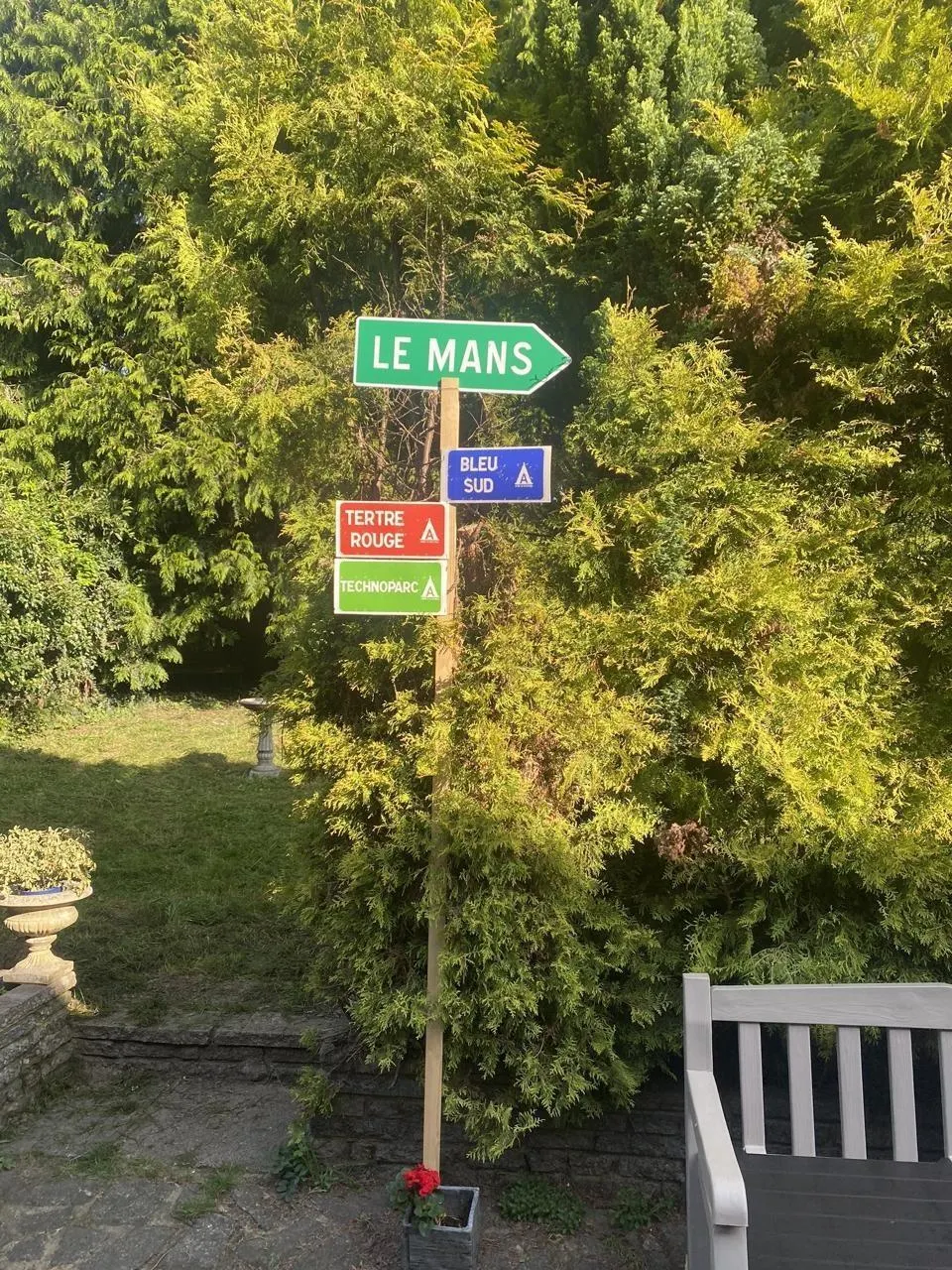 Porte de garage customisée Ferrari, panneaux indiquant les directions du Mans et des campings du circuit, drapeaux à damier… son jardin est relooké le temps d’un week-end !