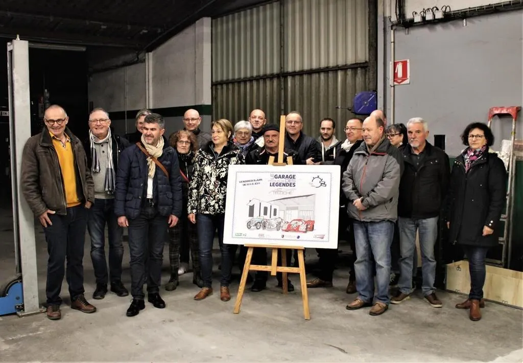 Au Garage des légendes, à Teloché (Sarthe), en compagnie des acteurs du rassemblement prévu le 9 juin 2023, à la veille du centenaire des 24 Heures du Mans, Marie-Noëlle Sébillet (à droite) a dévoilé l’affiche faite par un habitant de Teloché. © Ouest-France