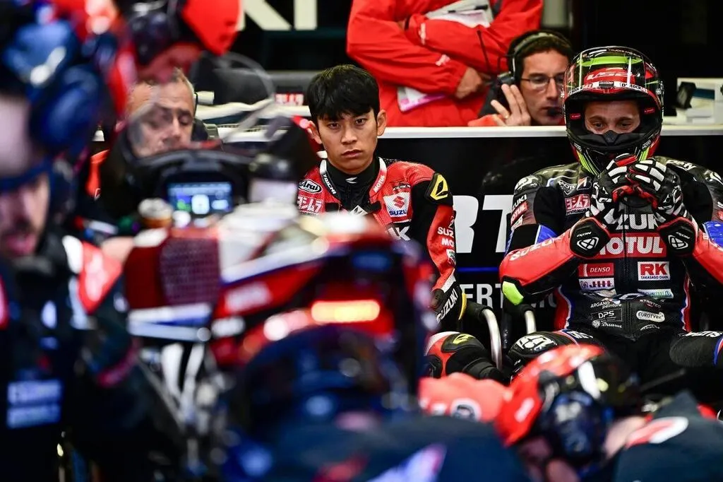 Cocoro Atsumi (au centre) fait grise mine, alors que la moto pilotée par Gregg Black (à droite) est aux soins des mécanos du Yoshimura SERT Motul. © Vincent Michel / Ouest-France