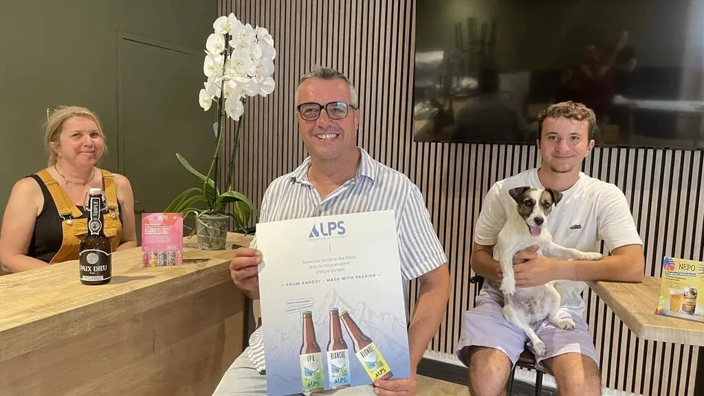 La famille Tricot gérera le bar PMU qui ouvre ce mercredi 2 juillet 2025 : Franck (au centre), Sonia et Nathan avec le chien mascotte Uggy. © Le Maine Libre