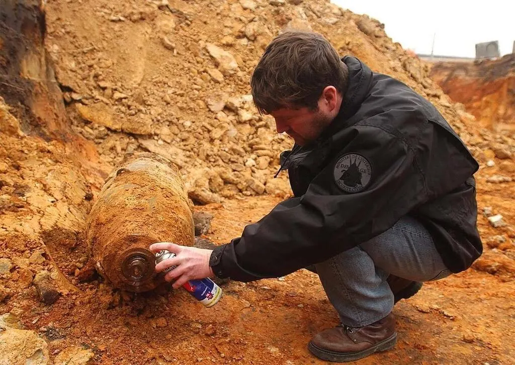 Découverte d’une bombe américaine lors du chantier de la nouvelle courbe Dunlop en janvier 2006. archives Le Maine Libre – Denis Lambert