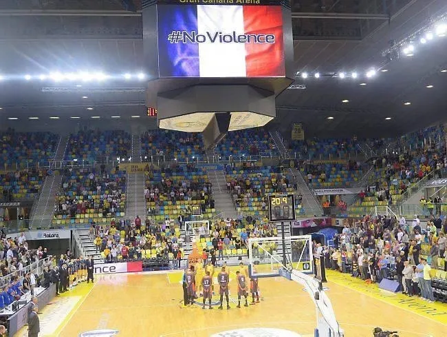 L'impact des terribles attentats parisiens a largement dépassé les frontières de l'Hexagone. À plus de 3 000 kilomètres de Paris, à Las Palmas, capitale de l'île de Grande Canarie, une poignante minute de silence a été observée dans la Gran Canaria Arena juste avant le coup d'envoi. Le public debout, tous les joueurs en cercle autour du rond central, une musique de recueillement et un message fort sur le cube d'affichage au plafond. Un « no violence » sur fond de drapeau tricolore. Les Manceaux arboraient une bande noire sur l'épaule droite de leurs maillots.