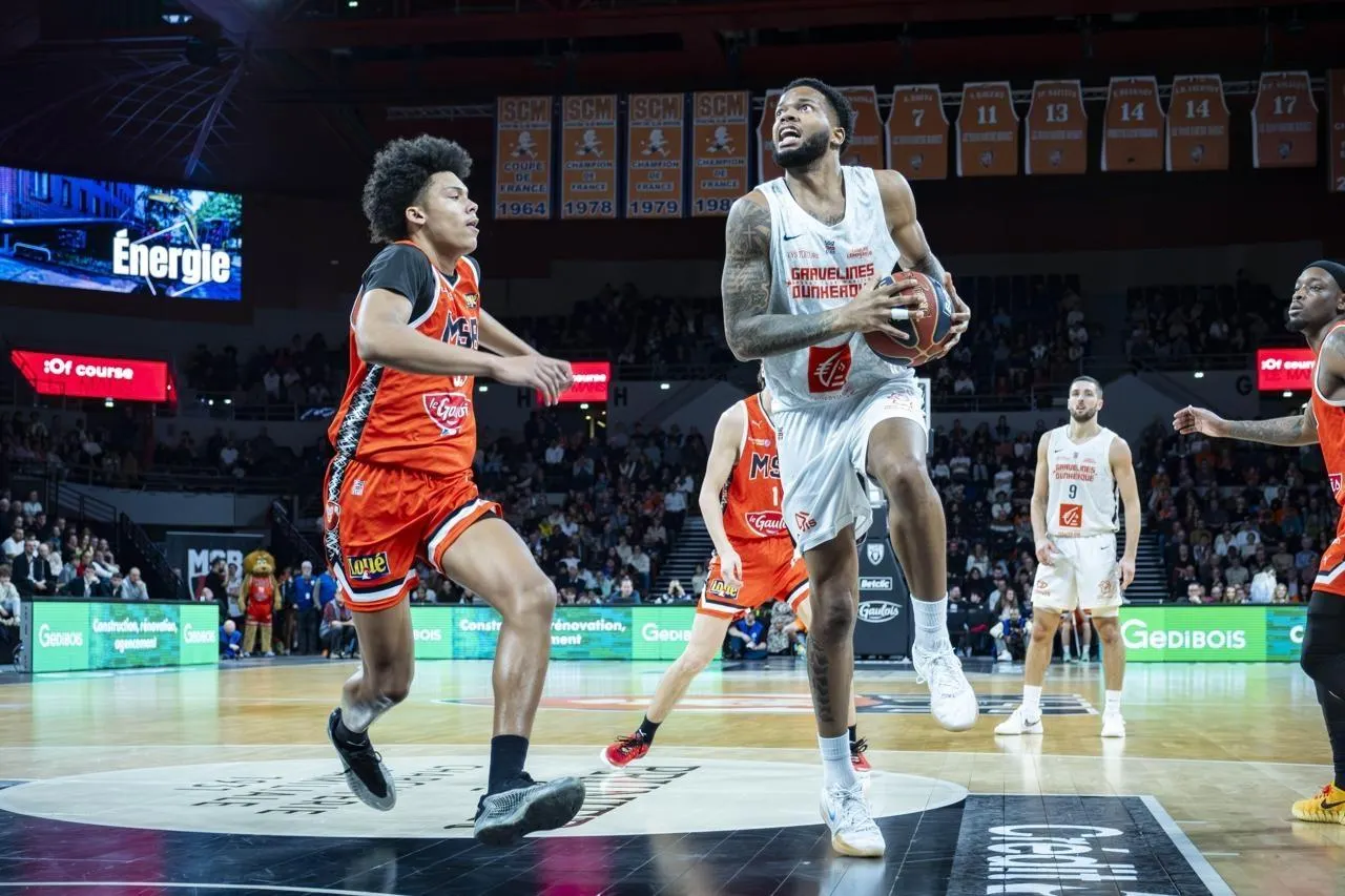 Le Manceau Swann Penda (à gauche) au duel avec le joueur de Gravelines Dunkerque David Choplin, le 20 décembre 2025. © DOMINIQUE BREUGNOT/OUEST-FRANCE