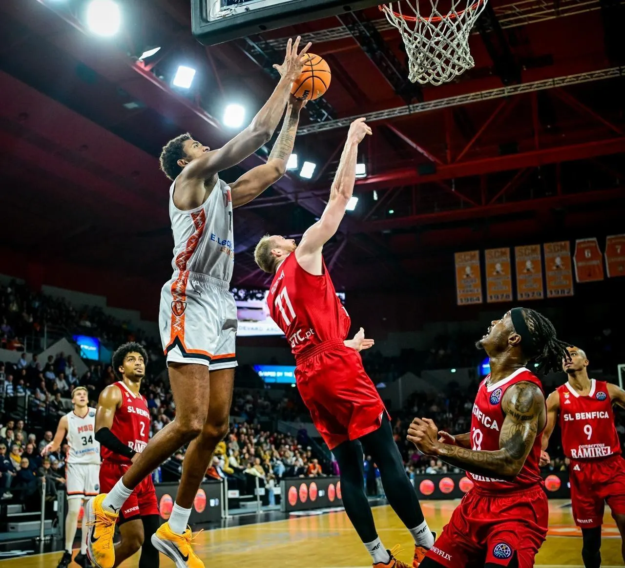 photo  le pivot manceau jonathan jeanne (en blanc) contre le benfica, le 21 octobre 2025 à antarès, lors de la 3e journée de ligue des champions.  ©  photo : le maine libre - yvon loué 1