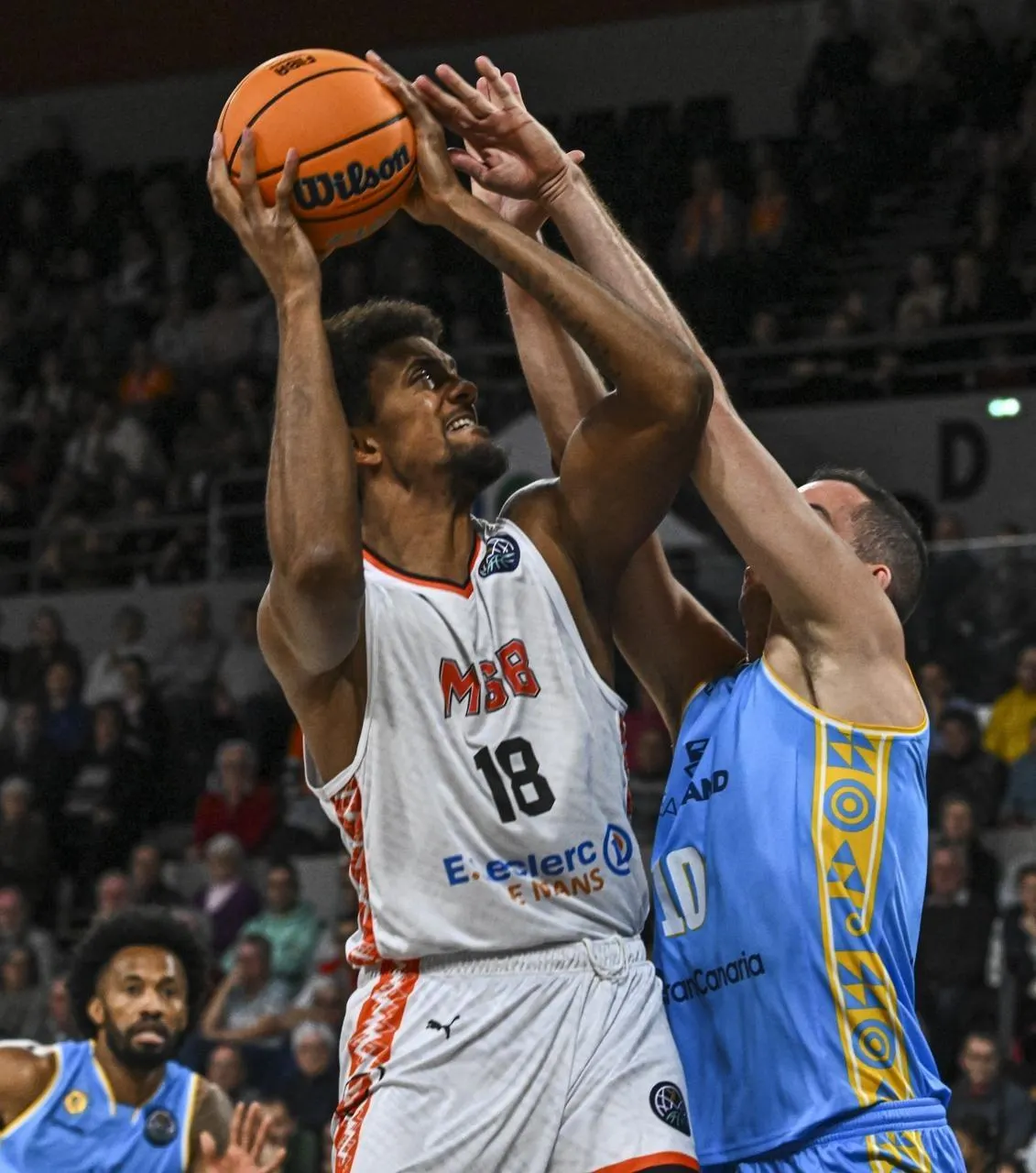 Le pivot manceau Jonathan Jeanne, le 18 novembre 2025 à Antarès, lors du match de Basketball Champions League entre Le Mans et Gran Canaria. © Photo : Le Maine Libre - Denis LAMBERT