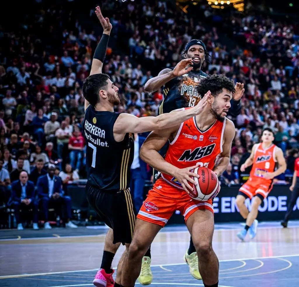 Le Manceau Noah Penda lors de la finale de la Coupe de France de basket contre Paris, le 26 avril 2025 à Bercy. © Photo : Le Maine Libre - Yvon LOUÉ