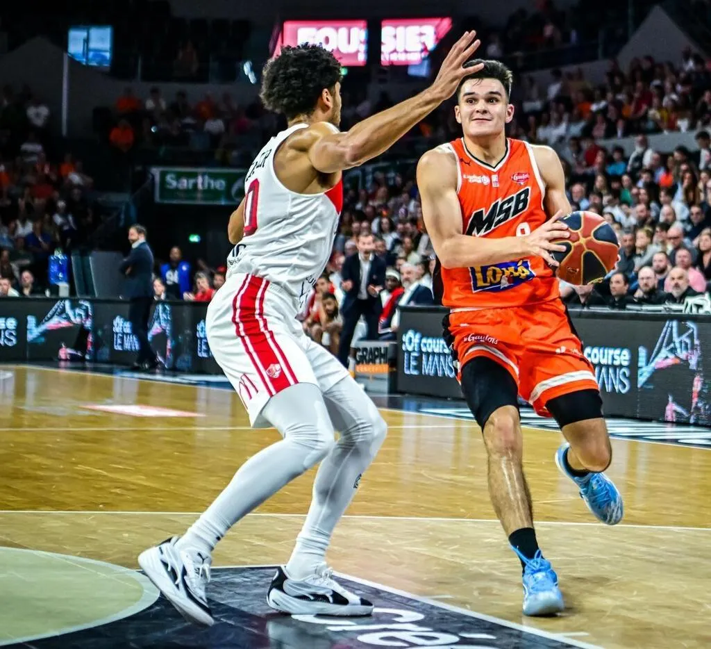 Léopold Delaunay lors du match de Betclic Élite contre Bourg-en-Bresse, le 29 avril 2025, à Antarès. © Le Maine Libre - Yvon LOUÉ