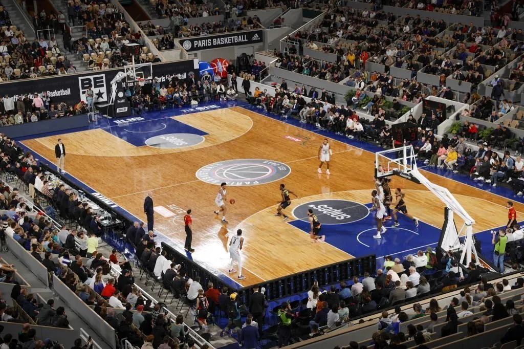 Le court Philippe-Chatrier, Ã Roland-Garros, en format basket pour un match de championnat de France entre Paris et Monaco, en octobre 2022. © GEOFFROY VAN DER HASSELT / Archives AFP