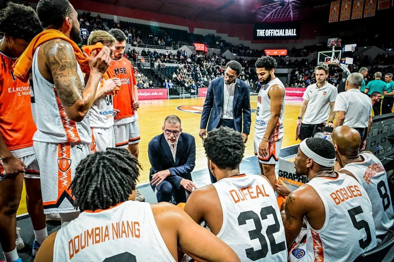 L’entraîneur manceau Guillaume Vizade, entouré de ses joueurs et de son assistant K.J. Smith, le 8 janvier 2026, lors du match retour du play-in de la Ligue des champions de basket contre Mersin. © Le Maine Libre - Yvon LOUÉ