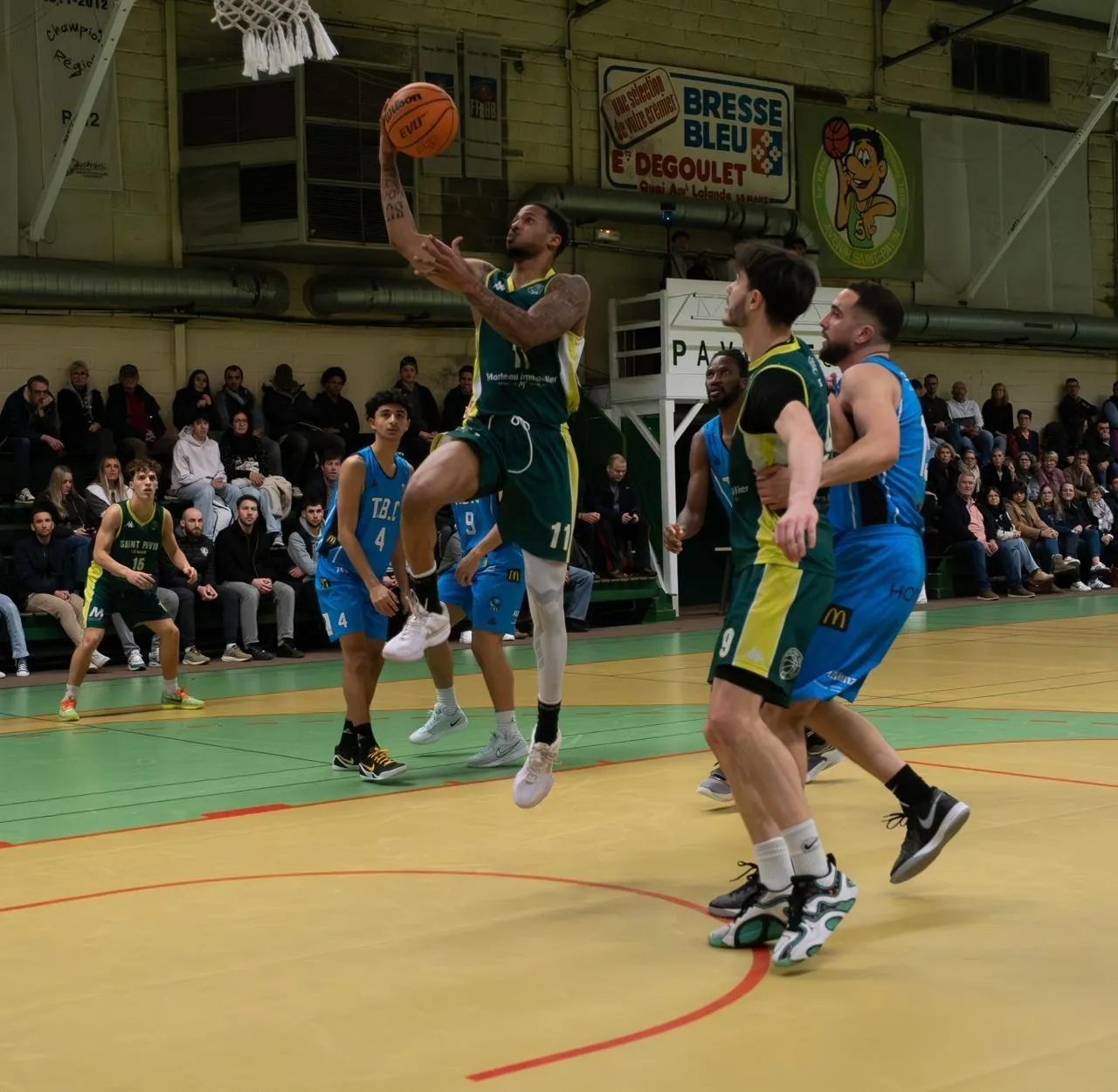 Les joueurs de Saint-Pavin (en vert) s’étaient inclinés à domicile contre Touraine BC, en Nationale 3, samedi 13 décembre. © Le Maine Libre