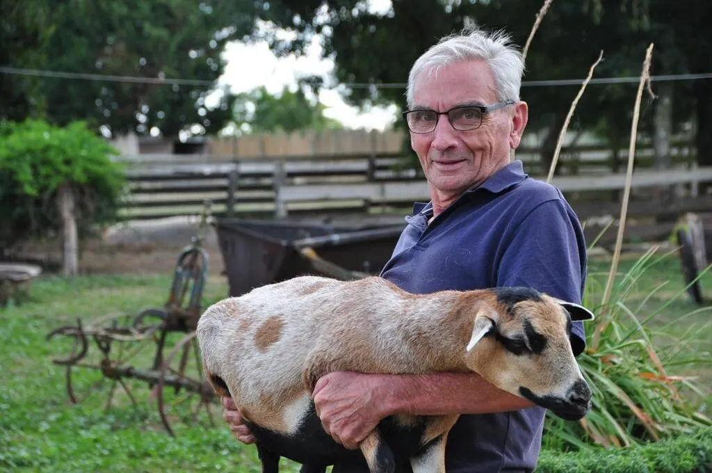 Joël Mahé, c’est une vie passée auprès des animaux. Il est ici avec Douala, un mouton du Cameroun. © Le Maine Libre