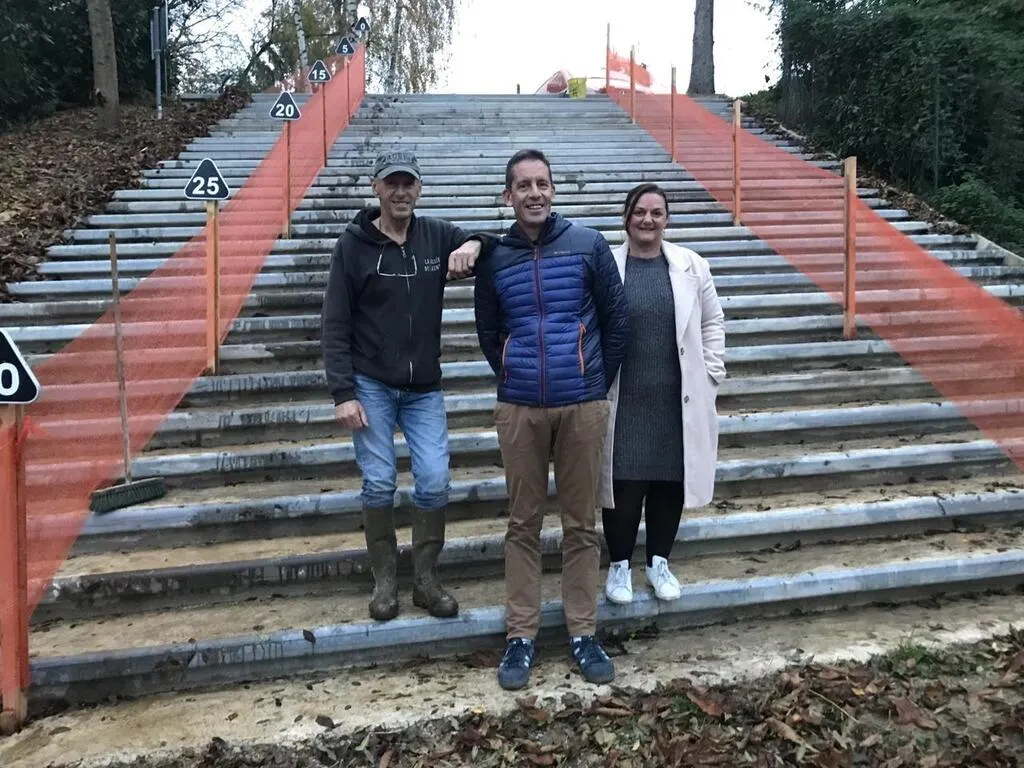 Jean-René Poupon, Sylvain et Delphine Beury, au pied des trente marches qui constituent le juge de paix du parcours belmontais. Sur la gauche, des panneaux indiquent le nombre de marches qu’il reste à gravir. © Ouest-France