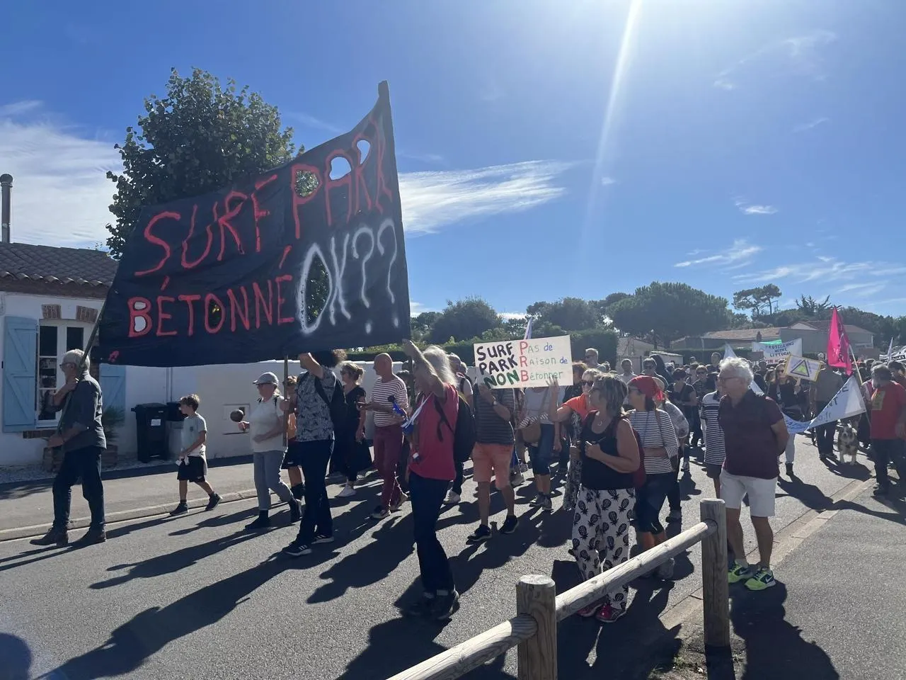 Des opposants au surf park de Talmont-Saint-Hilaire (Vendée), lors d’une manifestation contre le projet, le 28 septembre 2025. © Ouest-France
