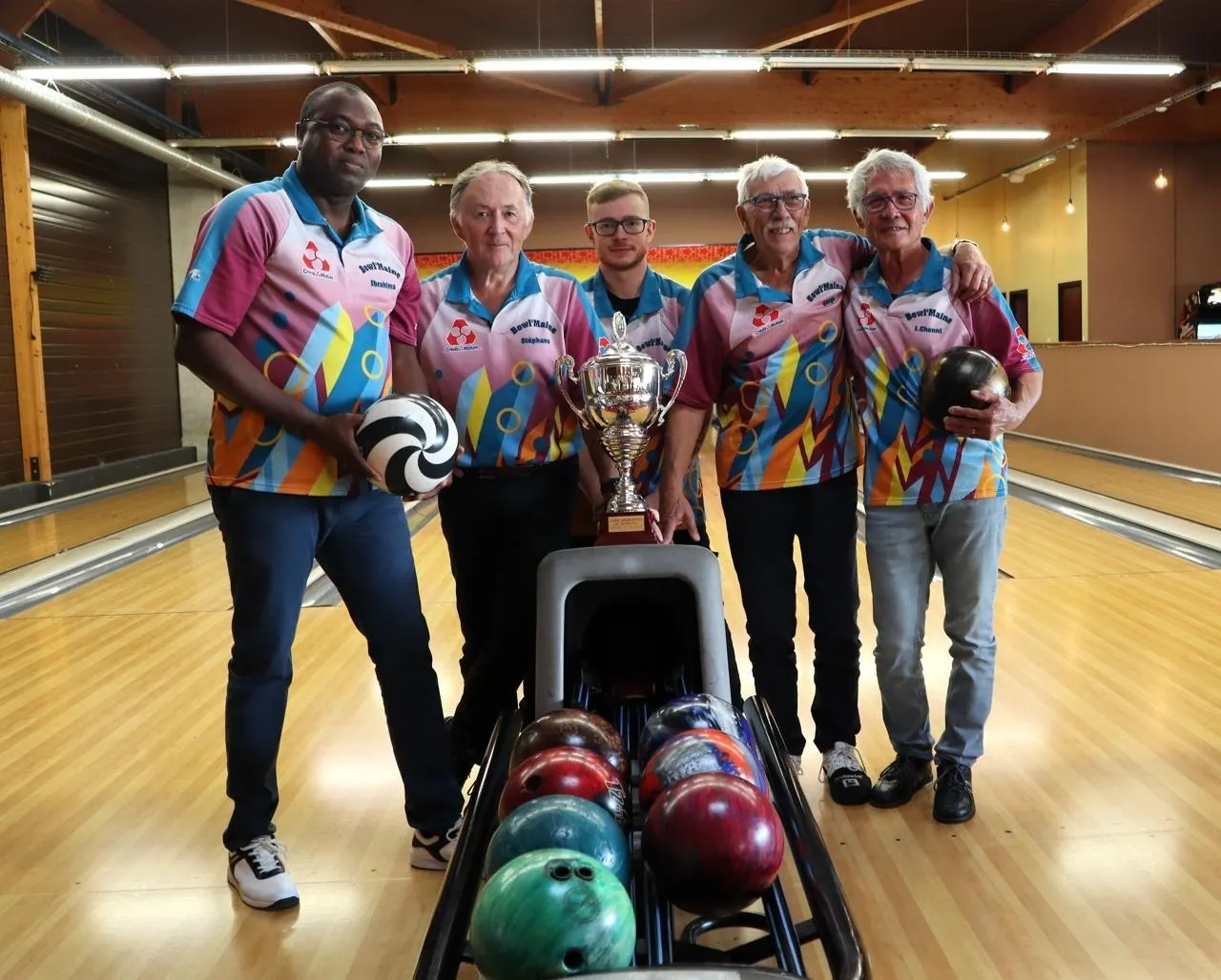 Ibrahima Touré et des licenciés du club Bowl’Maine de Sablé-Solesmes, réunis autour du Trophée de la Sarthe, remporté en 2025. © Ouest-France