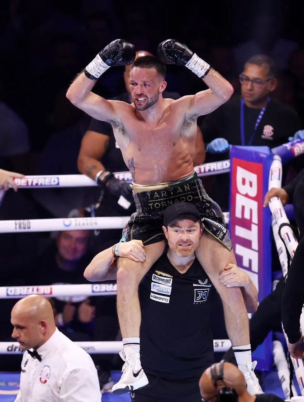 Josh Taylor après sa victoire en super-légers face à Jack Catterall, le 25 mai 2024 à Leeds. © George Wood / Getty Images via AFP