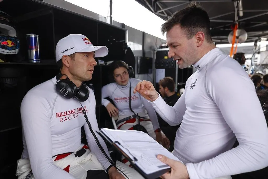 Sébastien Ogier (à gauche) à l’écoute du futur vainqueur des 12 Heures de Sebring, Matthieu Vaxivière (Alpine). © DPPI