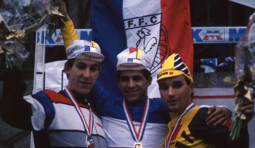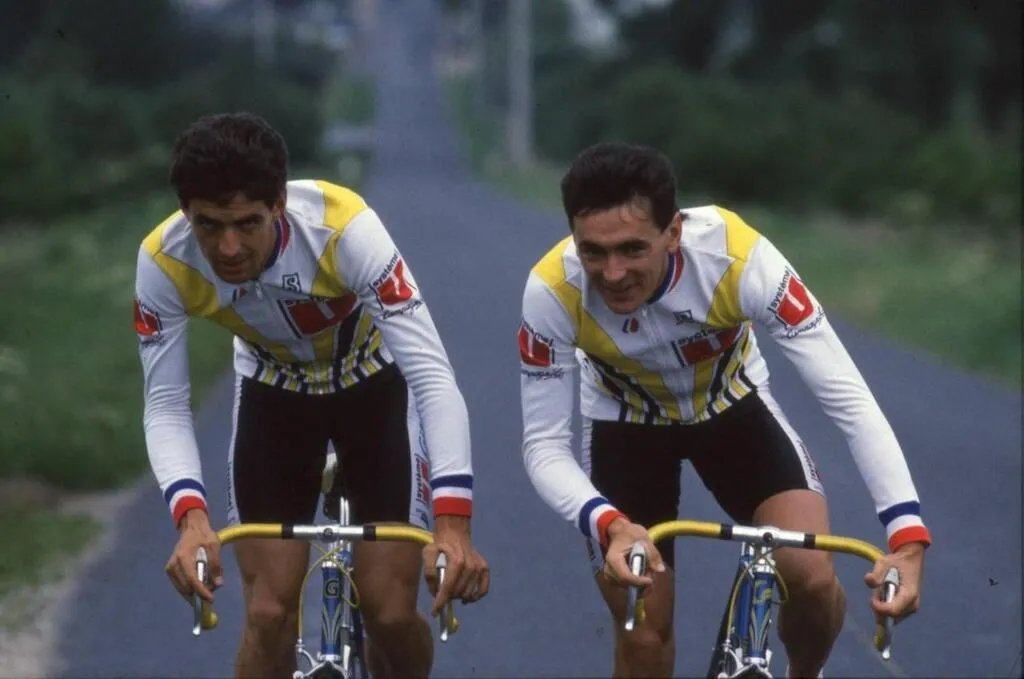 Marc Madiot (à gauche) à l’entraînement avec son frère Yvon Madiot, à Renazé (Mayenne) le 25 juin 1987, quelques semaines après leur doublé lors du 1er cyclo-cross professionnel international de Sablé-sur-Sarthe. © OUEST FRANCE archives