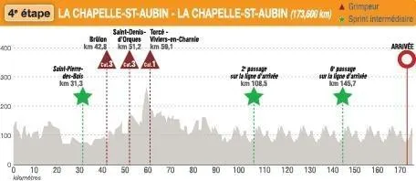 Au programme de la journée : 3 points chauds (km 31,3,108,5 et 127,1) et 3 grimpeurs (km 42,8, 51,2 et 59,1)#CircuitSarthe
