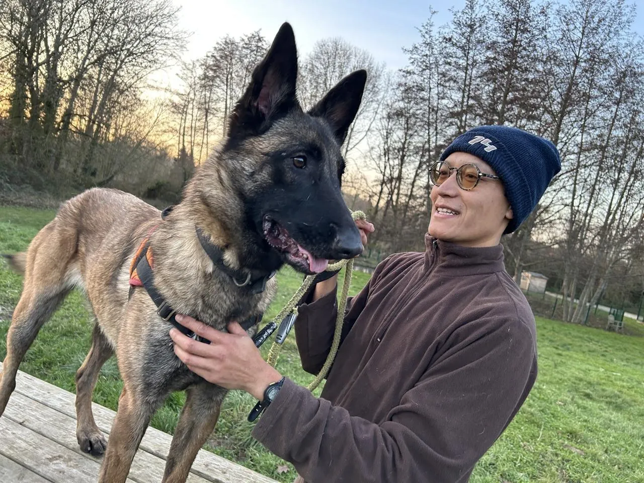 Avec longe et harnais, Jarod va courir en compagnie de Vénus, une énergique et affectueuse femelle berger malinois. © Ouest-France