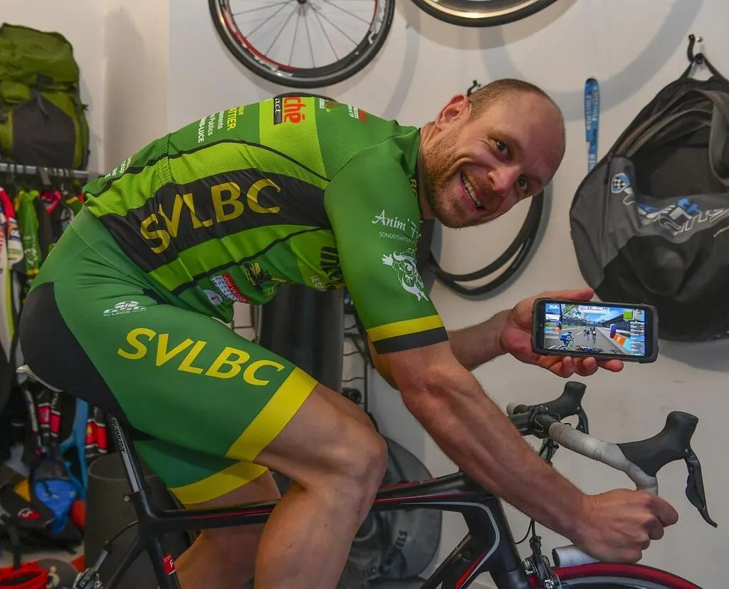 Mickaël Diguet en pleine séance de home-trainer, dans son garage, avec l’application Swift. © Le Maine Libre – YVON LOUE