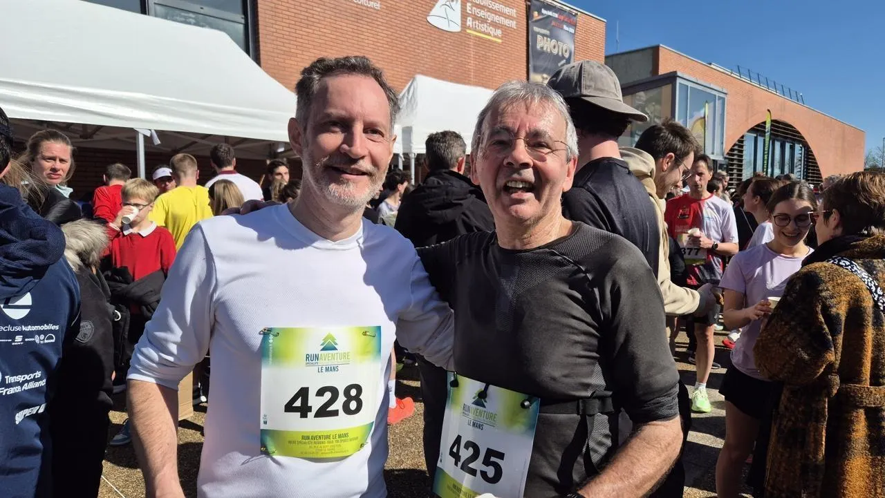 Philippe Buon (à droite) et Damien, son voisin, à leur arrivée des 10 km de Sartgé-lès-Le Mans (Sarthe). © Ouest-France